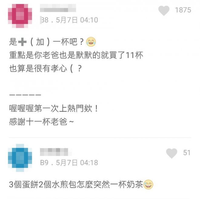 個女寫左「3個蛋餅+2個水煎包+一杯大奶茶」,但爸爸就睇咗「11杯大奶茶」。