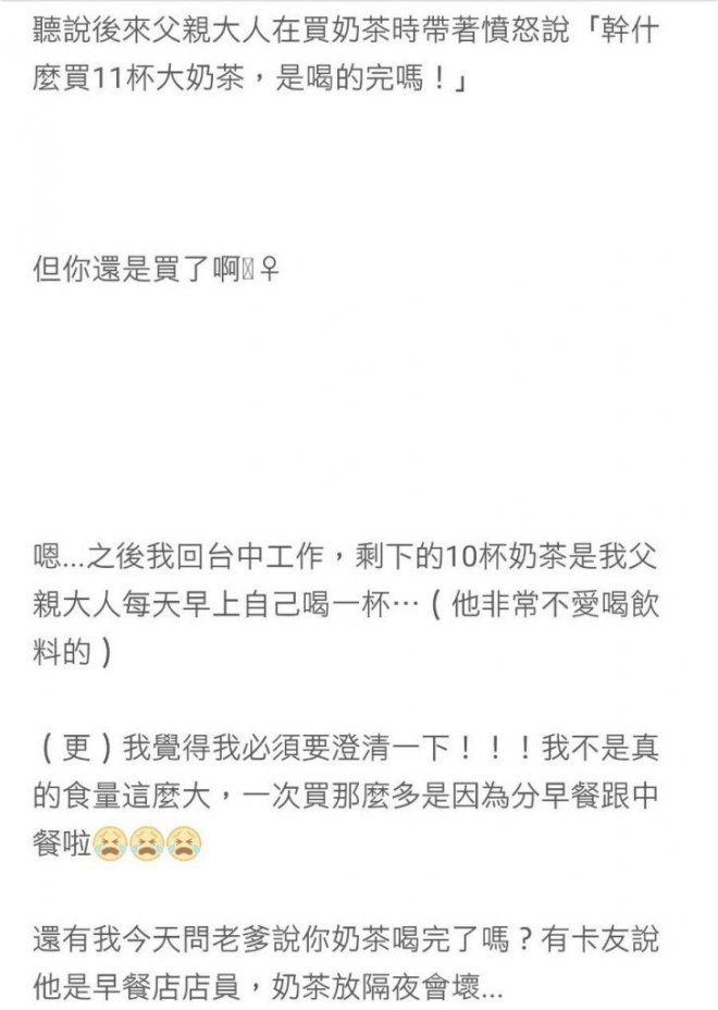 聽說後來父親大人在買奶茶時帶著憤怒說『幹什麼買11杯大奶茶,是喝的完嗎!』