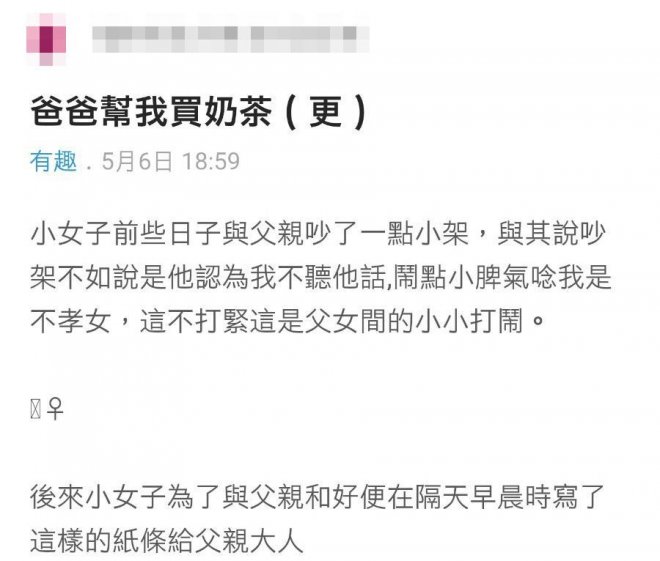 呢位爸爸真係好得意,好QQ,最後肥仔黎都祝福呢對新人新婚快樂。買早餐擺咗大烏龍相信大家都聽過,爸爸係個女嘅前世情人。有個女仔自稱係不孝女,喺台灣Dcard度出Post「爸爸幫我買奶茶」,話佢同爸爸嘈咗交,被罵係不孝女,為了同爸爸和好,佢出咗一樣法寶。不孝女就佢同咗爸爸嘈交,但為咗和好,佢決定寫張紙條俾父親大人。