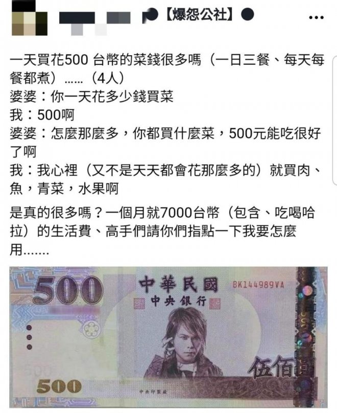 根據《ETtoday新聞雲》報導,原PO無奈的說「家裡4人每天三餐都是我煮,買菜的花費是一天500元,卻被婆婆唸『怎麼那麼多,你都買什麼菜,500元能吃很好了啊。』,平常也就買肉、魚、青菜和水果,也不是天天都會花到500元,是真的很多嗎?而且我一個月只有7000元的生活費,請大家指點我一下。」。