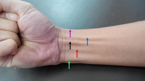 手腕上的「筋」有不少條,對應關係可以看下圖: