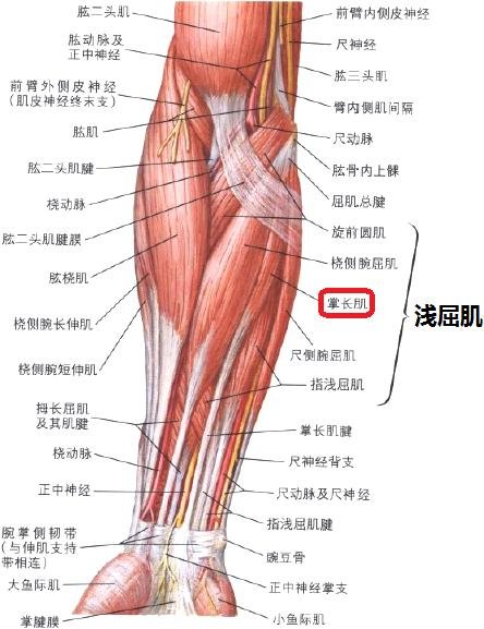整個淺屈肌我們也可以統稱為腕屈肌群,他們整體寫作可以讓我們做出勾手腕(腕屈)的動作。掌長肌每個人都應該有,即便功能性差,肌肉會萎縮、體積小,但肌肉數量應該不變。