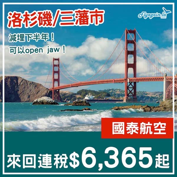 【美國西岸】減埋下半年!國泰航空直航來回洛杉磯/三藩市連稅$6,365起!11月27日或之前出發