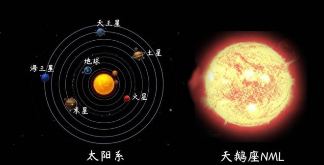 這是一顆紅特超巨星,位于天鵝座,距離地球大約5500光年。天鵝座NML的半徑大約是太陽的1650倍,即大約11.5億公里,體積大約是太陽的45億倍,位列十大恒星排行榜第三位。把天鵝座NML放在太陽系中心太陽的位置上,它的半徑快接近土星軌道了。天鵝座NML的質量大約是太陽的50倍。天文學家認為,這顆恒星只有600萬年的壽命。最終它會在超新星爆發后成為一個黑洞。