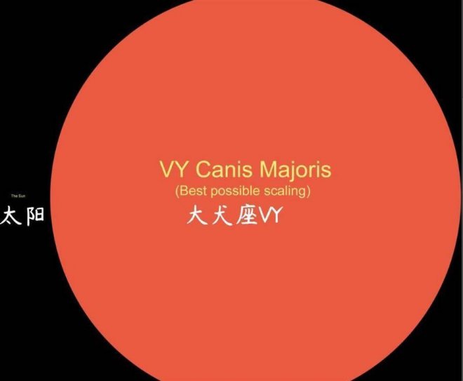 大犬座VY是一顆位于大犬座的紅特超巨星,質量約為太陽的30~40倍,距離地球3900光年。大犬座VY的半徑約有1420倍太陽半徑,即大約9.88億公里。因此,要是把這顆恒星放在太陽系中心太陽的位置上,它的表面也會超過木星軌道。它可以裝得下大約29億個太陽,是目前已知的體積第九大恒星。與此同時,大犬座VY的亮度是太陽的50多萬倍,是目前已知的最亮的恒星之一。