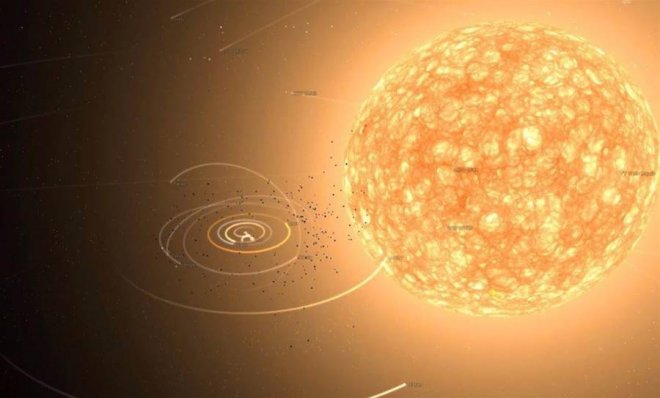 最后我們把史蒂文森2-18放在太陽系中心太陽的位置上,它的半徑會超過土星軌道。土星也被它吞沒了。