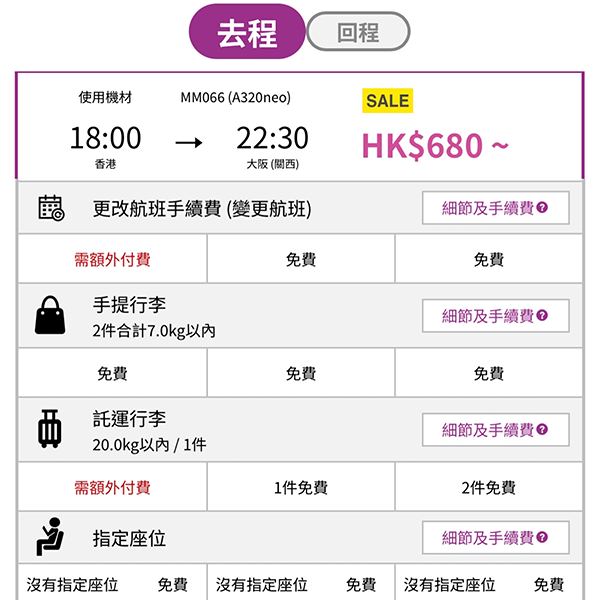 來回連稅價錢:HK$1,760起(只限去程MM66 18:00/22:30,回程MM63 08:15/11:50),其他航班各加HK$280/位/程
