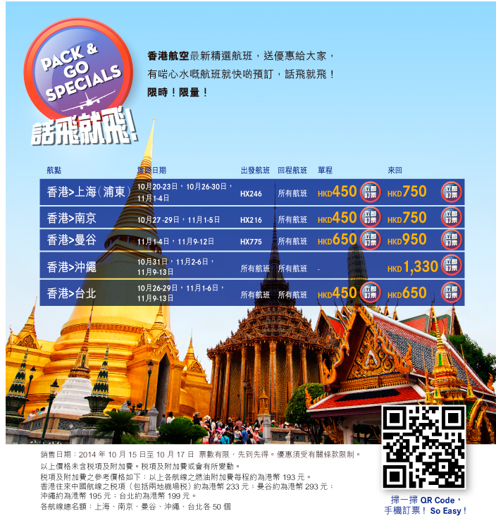 新一期 香港航空 話飛就飛 優惠,主打10月同11月出發