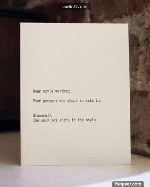 「親愛的觀眾,這電影裡唯一的性愛場面就要播出,而您的父母也要進場,請好自為之。」