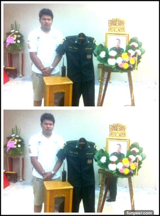 這個人正在與死者的制服拍照。這名死者在救人時死去,當時人們沒有找到他的鞋,出現在相框後面的神秘的腿上也沒有鞋子。