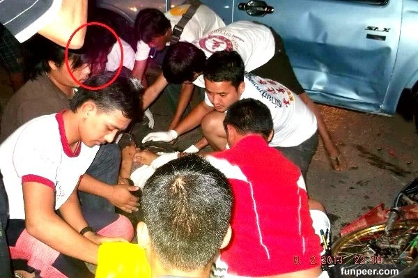 人們正在救助發生車禍的人,仔細觀察會看到,人群中有一個全身是血的人正在注視著地上的屍體,也許他只是在看自己。