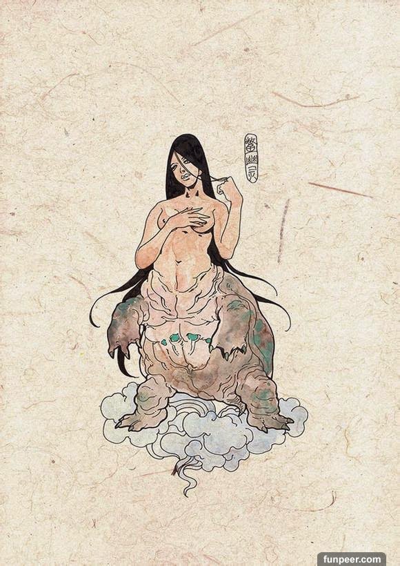 上半身是人,下半身卻是鱉。有一個發生在北京穌姓書生身上的故事,他的房前有一個池塘。池塘的對面是一間屋舍,窗戶時常是開著的,但是不知道那裡是否住人。一天傍晚,這位書生看見對面那間屋舍的窗邊竟站著一位黑發美女。這個女子長得很美,不過身上的穿著卻已過時。書生對此念念不忘,便命令自己的學生去打聽那個女子是誰。可是,學生卻回答說那個房屋沒有住人。書生覺得非常可疑,想親自弄個水落石出。於是,當那個女子又站在窗前時,他便悄悄地來到那間屋舍。沒想到,那裡站著的竟是一個上半身是美女,下半身是鱉的怪物。書生大吃一驚,怪物也因被人發現自己的真面目而驚慌失措,立刻便跳進池塘里去。