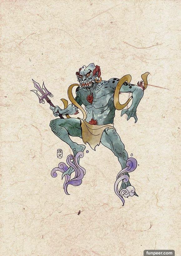 老魚跳浪,瘦蛟婆娑;巡行不已,盡職盡責,夜叉是古代傳說中一種半鬼半神的小神靈。從梵文音譯而來。最初乃印度神話中的神靈,後成爲中國古代傳說故事中經常出現的角色。「夜叉」意譯,一爲「捷疾鬼」,謂其勇猛迅疾,常爲龍王巡海,爲閻王巡夜。