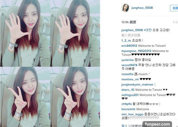 ▼EXID成員正花在Instagram上PO出在機艙裡自拍的照片,並寫道「台灣GOGO!」