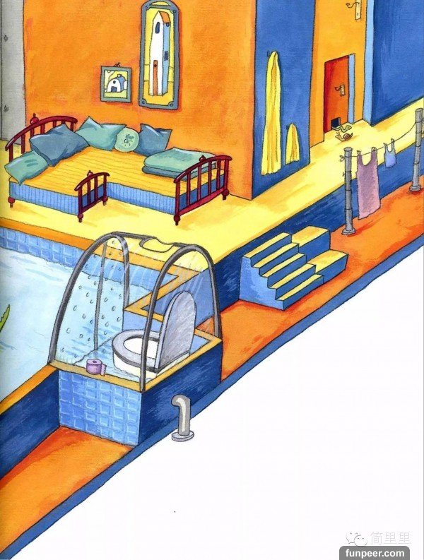 仔細觀察,不光是出現了一個水池,馬桶、樓梯、晾衣架、床、門也都設計成了適合牠們倆的樣式。