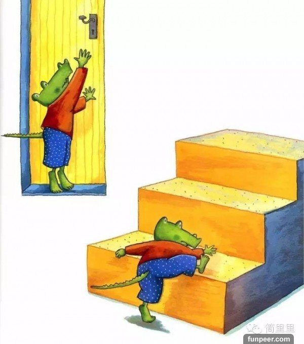 看!長頸鹿小姐家的樓梯對鱷魚先生來說實在是太高了。
