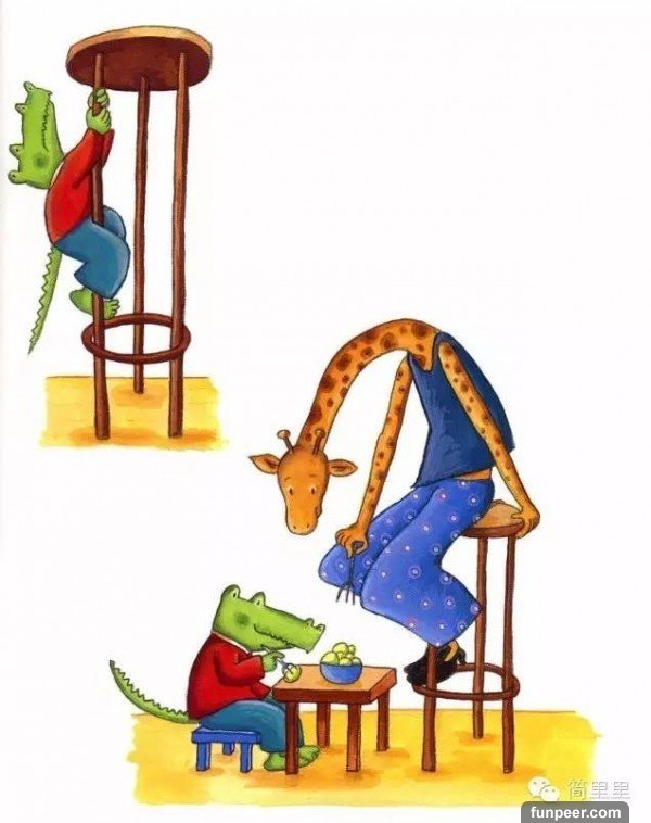 就像鱷魚和長頸鹿一樣,最開始他們彼此遷就,他們住在鱷魚的房子裡,可是鱷魚的房子太小了,長頸鹿住得很不舒服;鱷魚就提議搬到長頸鹿的房子裡去住,但是長頸鹿的房子又太大了,對於鱷魚來說,也有諸多不便。