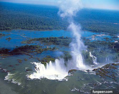 「伊瓜蘇」在南美洲土著居民瓜拉尼人的語言中,是「大水」的意思。發源於巴西境內的伊瓜蘇河在匯入巴拉那河之前,水流漸緩,在阿根廷與巴西邊境,河寬1500米,像一個湖泊。水往前流陡然遇到一個峽谷,河水順著倒U形峽谷的頂部和兩邊向下直瀉,凸出的岩石將奔騰而下的河水切割成大大小小270多個瀑布,形成一個景象壯觀的半環形瀑布群,總寬度3000米至4000米,平均落差80米。