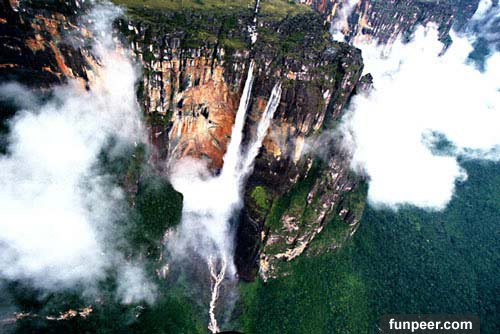 天使瀑布又叫安赫爾瀑布或者丘倫梅魯瀑布,是世界上最高的瀑布,位於委內瑞拉東南部、卡羅尼河支流卡勞河(Carrao)源流丘倫河(Churun)上,當地的印第安人取名為「出龍」。河水從蓋亞那高原奧揚特普伊山(AuyanTepui)的陡壁直瀉下來,落差達979米,大約是尼亞加拉瀑布高度的18倍。瀑布分為兩級,先瀉下807米,落在一個岩架上,然後再跌落172米,落在山腳下一個寬152米的大水池內。這個地區的熱帶雨林非常茂密,不可能步行抵達瀑布的底部。雨季時,河流因多雨而變深,人們可以乘船進入。在一年的其他時間裡,只能從空中觀賞瀑布。1937年首次為美國飛行員詹姆斯.安赫爾(JamesAngel)發現,故以其名命名。