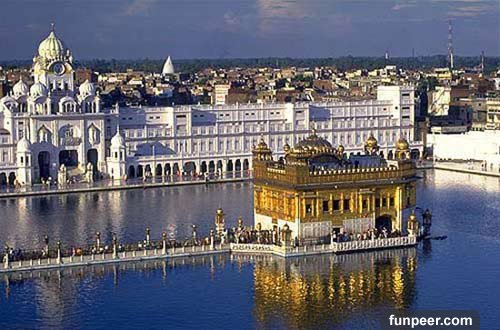 金廟位於印度邊境城市阿姆利則。作為錫克教的聖地,阿姆利則意為「花蜜池塘」。當年只是印度教改革派分支的錫克教,經過幾代教徒的不懈努力,最終於16世紀發展成完全獨立的宗教,為此,當年錫克教第4代祖師羅姆·達斯曾修建了一座水池,名為「花蜜池塘」,阿姆利則由此得名。而金廟則由錫克教第5代祖師阿爾瓊1589年主持建造,1601年完工,迄今已有400年歷史。因該廟門及大小19個圓形寺頂均貼滿金箔,在陽光照耀下,分外璀璨奪目,一直以來被錫克人尊稱為「上帝之殿」。