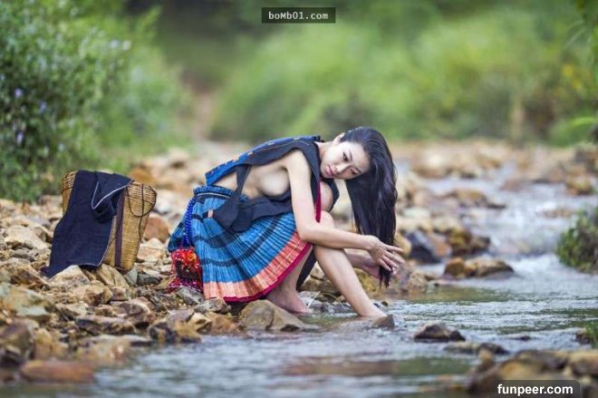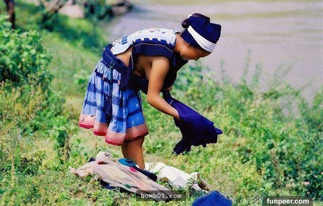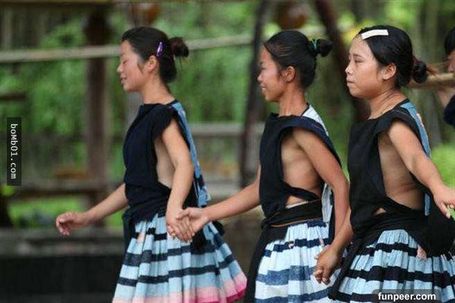 ▼白褲瑤族崇拜女性的生殖器,從而衍生出對女性乳房的崇拜。因為他們認為乳房是哺育後代的典型象徵。瑤族女孩夏季穿的上衣很特別,只有一前一後兩塊布,很隨意的搭在肩上,每面也沒有胸罩或者其他內衣,從側面就能看到若隱若現的雙峰。如果彎腰幹活,更是一覽無餘。