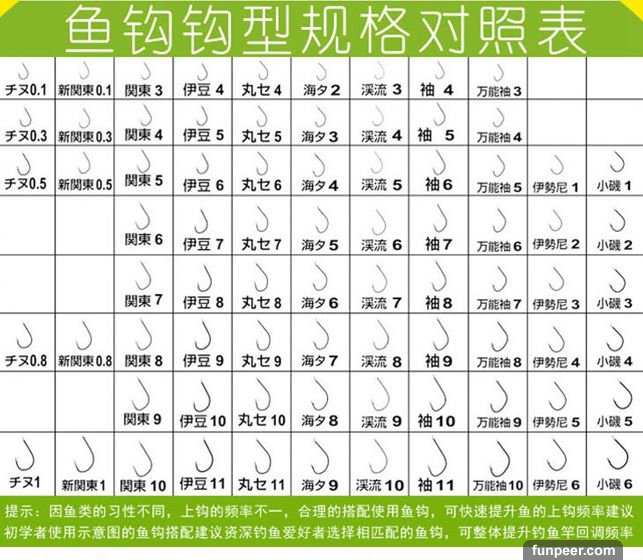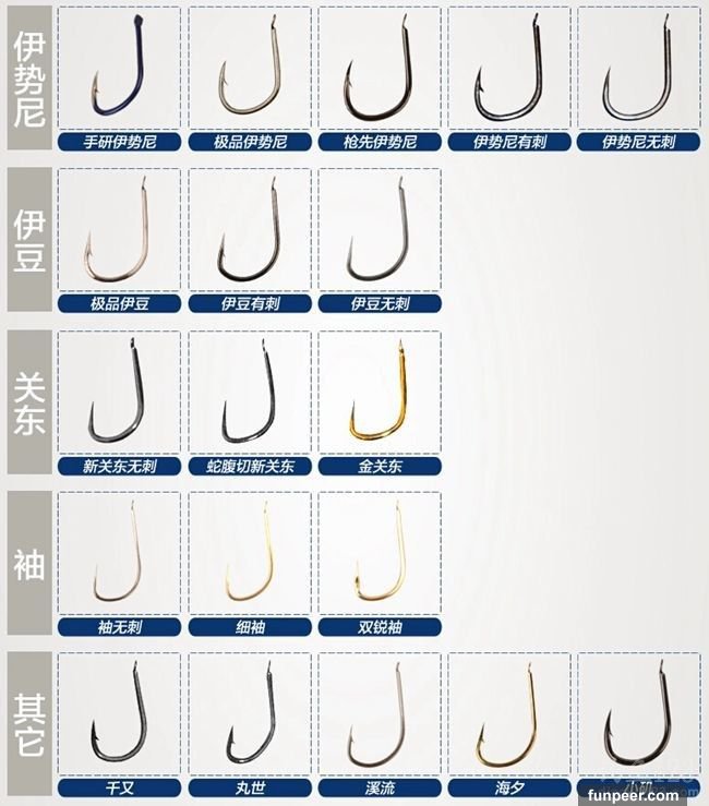 伊勢尼:大魚必殺魚鉤,鉤條粗,鉤門寬,鉤柄較短。伊勢尼非常適合釣底的鉤型,由於鉤尖微微內彎,一般中魚后很少脫鉤跑魚。伊勢尼不僅適合手竿垂釣,也廣泛的用於爆炸鉤和串鉤。伊勢尼是休閑野釣大鯉魚草魚最常用的鉤型。伊豆:大小通殺魚鉤,初學釣魚很多釣友都是從使用伊豆魚鉤開始的,就是其大小通殺的特點被很多釣友所青睞。伊豆鉤型偏小,鉤條、鉤柄長度適中。鉤尖向一側傾斜5度左右。也被釣友稱為歪嘴鉤。由於鉤條適中,即使選用2#伊豆,也可以釣上來2斤多的魚,鉤條也不會變形。用它垂釣半兩一兩的小魚,也可以勝任。如果您想大魚小魚一塊釣不妨試試伊豆鉤。新關東:新關東無刺是懸墜釣垂釣綜合魚的常用鉤。鉤尖較直,長度適中,鉤底鉤門較寬。由於鉤條粗細適中,鉤型較大,並且無倒刺,在垂釣各種大中型魚類中被廣泛使用。不論釣底、釣浮、休閑、競技均能勝任。海夕,鉤底較寬,鉤尖稍微內斂,屬於鉤條較細的一種鉤。鉤條細、輕有利於穿刺,特別適合垂釣中、小型魚體。在魚受天氣、環境等影響,攝食不積極,魚口變輕時使用,也很容易入口。丸世,鉤尖內斂,鉤底較圓,也有釣友稱其為蛇頭鉤。由於鉤型細長,容易串掛蟲餌,有利於口形較小的魚類吸入,而且不容易脫鉤,適合垂釣中小型魚類,在串鉤釣法中也被廣泛應用小磯,這是目前淡水釣種最粗的。其鉤型偏大,接近伊士尼,但是鉤條更粗一些。主要用來垂釣大中型魚類。能經受住大型魚的衝擊.千又型魚鉤,鉤型較大,形狀接近伊士尼,但鉤尖內彎,鉤條適中,鉤底寬大,鉤門略窄。是一種非常適合搓餌釣底的魚鉤。由於其鉤尖長,內彎,中魚后不容易跑魚。