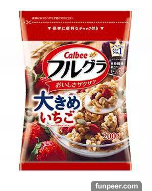 不要被可愛的外包裝給迷惑了,裡面其實是年幼的小螃蟹曬成的螃蟹干。味道咸中帶甜,嘎嘣脆。(新醬想知道還有什麼是他們不能做成乾的。。。。)calbee 草莓果肉穀物麥片