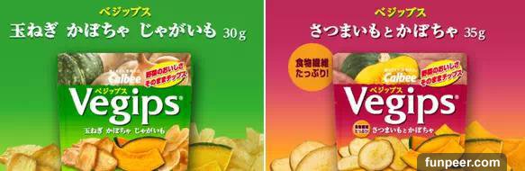 以大豆粉、黃豆和黑糖為主料的夾心餅,豆乳黃豆的香氣與威化餅融在一起,吃起來有股豆漿味。不過 Hmada這個牌在在日本並不大眾,想要嘗嘗的小夥伴們要多逛逛當地的便利店。CALBEE vegips蔬菜乾