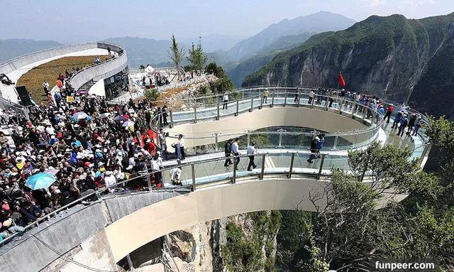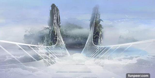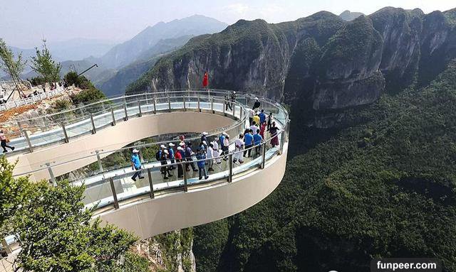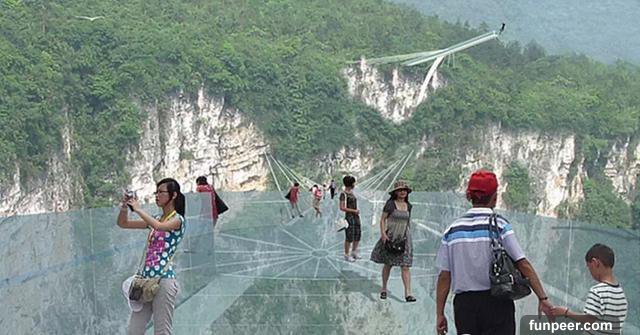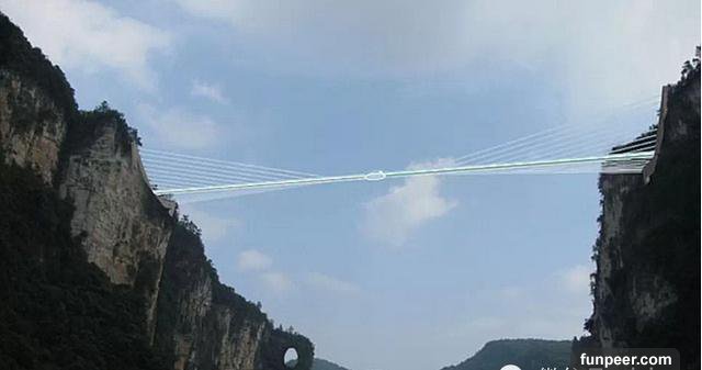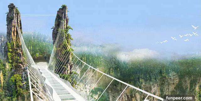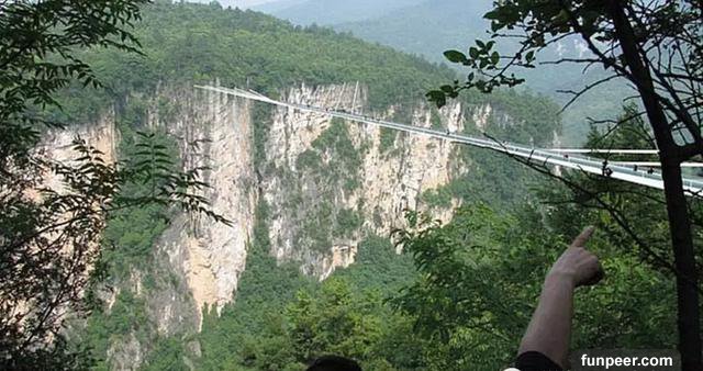 中國的張家界大峽谷最近剛剛建成了一條人工天橋,並且是全球最長最高的玻璃基橋樑,距離地面980英尺,兩側分別與懸崖連接,中間沒有任何支撐,喜歡冒險的遊客可以在今年7月份親身體驗一下了。