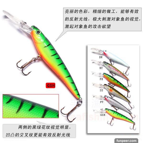 第七:塗裝這是一個最受爭議的環節,很多賣路亞的都拿塗裝如何牛如何炫說事,實際上這算得上路亞裡面最大的無知了,也表明了這隻路亞除了塗裝之外別無可取之處。淡水魚裡面只有BASS的視覺及色彩分辨能力較強,其它的多色弱,塘虱和鯰魚更是看到的所有顏色都是黑白,路亞的顏色說是賣給人看的一點都不假,只是選擇時需要注意的是如果出於夜釣及渾濁水體環境時,應選擇反射光線大的塗裝而已,試想一下,在渾濁的2米深水下,顏色還剩多少可以被看到,夜晚的1米深水下,還有顏色嗎?