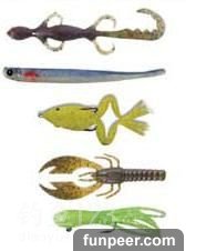 4、生物型軟餌除了上述的基本型之外,隨著近代模具技術的工藝進步,為了提高對象魚就餌幾率,除了泳型訴求,外型也有更深一層的要求,如蜥蜴型、魚型、蛙型、鰲蝦型等,諸如此類各式各樣的生物型軟餌。為了適用這些軟餌必須對周邊環境生態有通盤的觀察與了解,讓適用的軟餌更能融入環境、發揮水到渠成的效果。