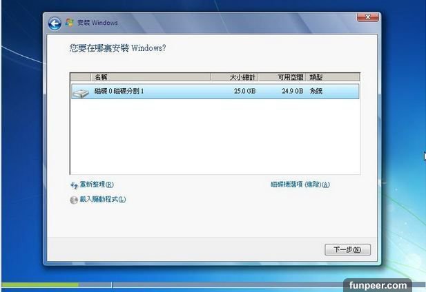 回到「安裝Windows」視窗後,按一下「重新整理」
