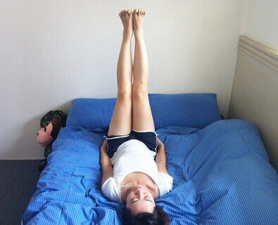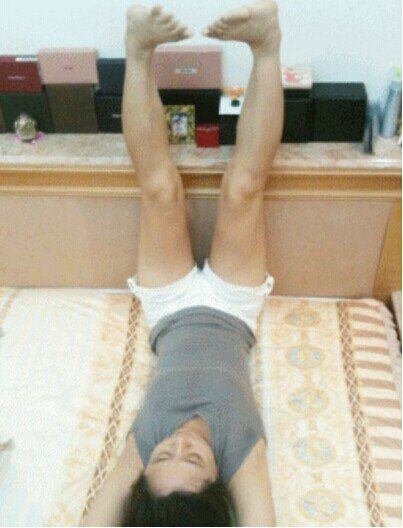 1、仰卧平躺,雙腿并攏,将腿擡高與身體垂直