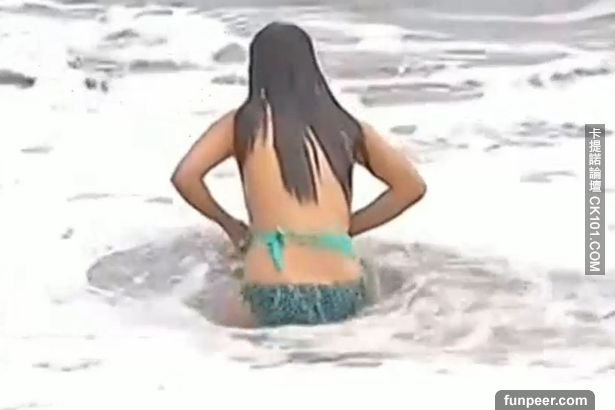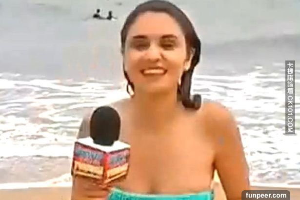 女主持人穿著比基尼跳入海中,但海浪非常「頑皮」,不斷讓比基尼滑落,只得一直「喬奶」 ,但第二次跳海時,海浪終於戰勝,整件比基尼從胸部滑到腰部,女主持人只能趕快拉好比基尼。