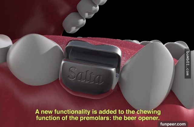 有了這樣的假牙,大家再也不用擔心找不到開瓶器,隨時想要喝啤酒都沒關係。但是這種形狀的假牙吃東西時不會塞住食物嗎?分享出去,讓大家看到這種多功能假牙,如果有機會的話你想安裝嗎?