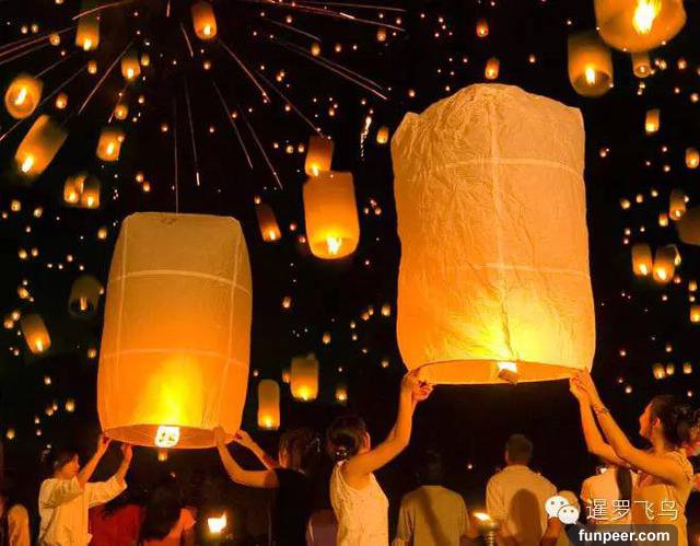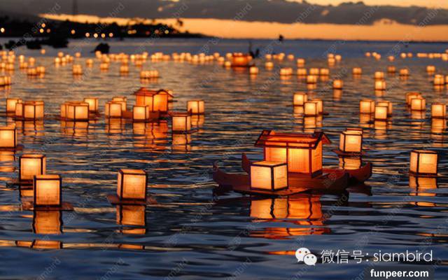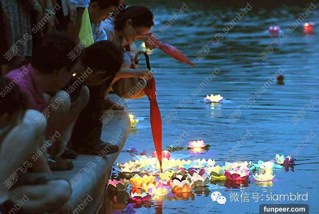 在夜空中搖曳的浪漫燈籠,為水燈節增添更多動人色彩當夜幕低垂,水燈節最美麗的時光開始,可以看見紅男綠女,或是父母偕同子女,人人手捧著各式各樣造型的水燈,或是塔形、船形和蓮花形等等,其中尤以蓮花造型的水燈最多最美。水燈中間,插有香燭、鮮花和彩色的小紙旗,以表示禮佛,也有在水燈上放數枚硬幣,表示布施。在放水燈前,人人都會在點燃香燭后,閉上眼睛,口中喃喃有辭,或在祝禱家人一年平安、幸福,或祈求孩子學業進步。不過更多青年男女,相攜來放水燈,多是為愛的祈禱,希望早締良緣,愛情永遠。