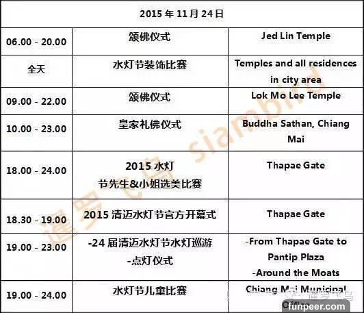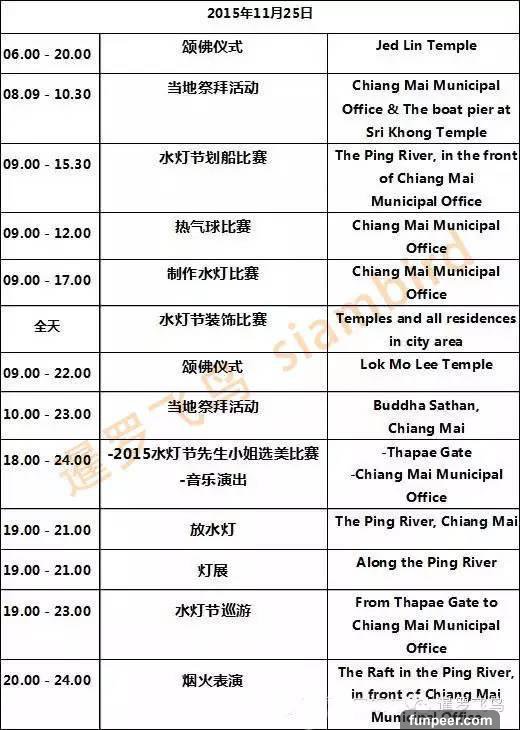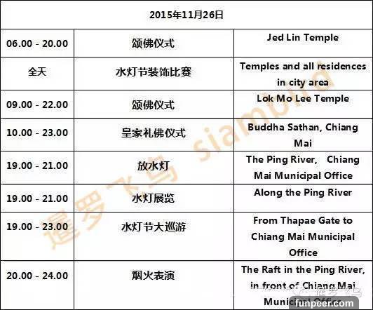 清邁及周邊地區清邁府(ChiangMai):將在2015年11月24-26日水燈節期間舉辦各種活動,如2015年11月24日放天燈,11月25日放小水燈比賽,11月26日放大水燈比賽以及製作水燈比賽等等.有關在湄南河上放水燈,在塔佩門和三王紀念碑廣場舉辦大型慶典活動等詳情可以諮詢清邁府政府辦公室,電話:053249169