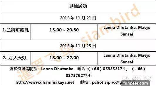 蘭納布施禮活動11月21日17:00-20:30在Lanna Dhutanka禮堂舉行,可以免費參加。蘭納國際天燈節它就是著名的萬人天燈了!全稱「Yee Peng Lanna International」收費場。2015年11月25日18:30-20:30在清邁申塞縣(San Sai)的Lanna Dhutanka禮堂統一放天燈。門票訂購網址:http://pitchiangmai.com/aticle2.html 僅限3000人哦!不過暹羅飛鳥認為沒票也沒太大關係,場外一樣能感受到天燈一同燃放的美麗。附:地址:清邁,Amphoe San Sai,TambonNong Han,Ban Mae Jo,Tudongkhasathan Lanna 電話:0 5335 3174