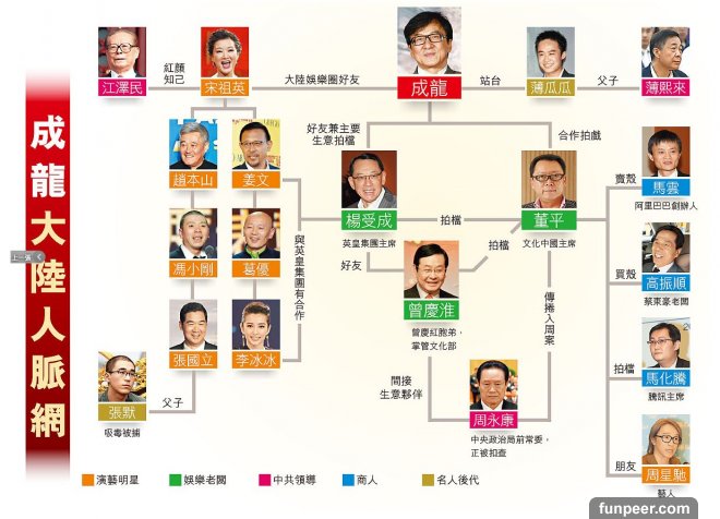 據蘋果日報報導,楊受成、曾慶淮、董平這「娛樂大亨鐵三角」關係密切,成龍和楊受成稱兄道弟,兩人在大陸行走江湖的靠山,就是曾慶紅(左)的人脈網。