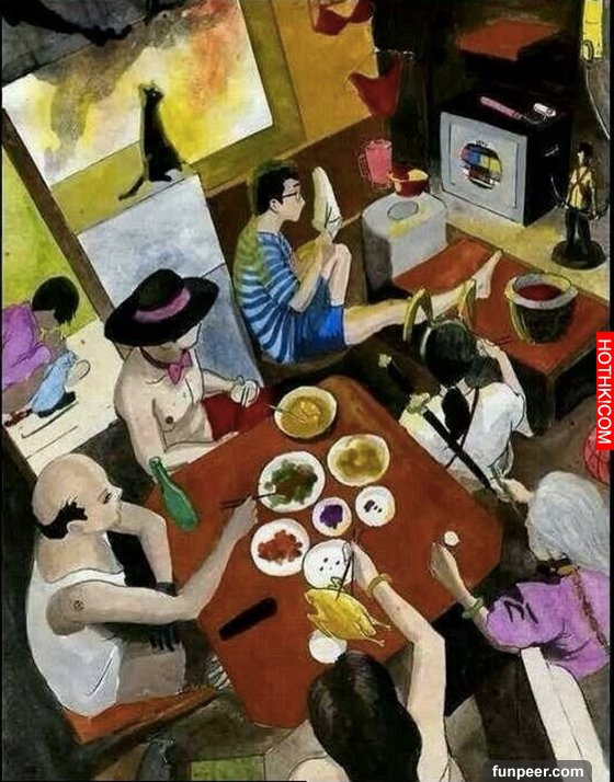 從這張圖片背景可以直觀看出那是一群人在一個非常狹小的房間裡吃飯,並且不難看出其中的人物關係:他們可能是一家人。在圖片右下角的一個白髮的女人可以看出她是奶奶,可怕的是她的脖子上栓著鐵鍊,桌子上的菜呈對角線擺開,她夠不到,而周圍的人都不在意她,鐵鍊,飯菜,以及奶奶蒼白的臉說明了一個問題,家裡人都想讓她死,她活着是一種拖累。奶奶旁邊坐着一個裸體的女人,她的位置姑且稱為女兒,她貪婪的把整隻雞刀進自己的碗裡,為什麼她有這樣的特權?那是應為她的淫亂,為什麼這麼說?電視機上的自慰器,以及電視機旁邊掛的貼身衣物,她的裸體,都可以說明這是一個淫亂的家庭,可以看出她極度不知廉恥,靠着肉體得利。裸體女人的旁邊禿頂的男人是爸爸,可是禿頂男人的臉異常清秀,從睫毛可以看出,一看就知道是個變態,他的桌下有一隻手,拒猜測是媽媽,他的褲子也褪下了一點,從角度來看,這只能說明一個問題,媽媽再給爸爸口交。。。爸爸旁邊廁所里便血的女兒,讓人看着不舒服,為什麼便血?大姨媽?不對,可能是被強姦過得原因,而強奸的人無非是那變態的禿頂男人,不知有沒有人看出禿頂男人的右臂,上面有個螺絲,可以得知那是個假肢,他的手又是被誰砍的呢?答:是坐在電視機前背着刀的女兒,她為了反抗爸爸的,而砍下了爸爸的右臂,背刀女兒的頭飾是一個兔女郎的裝扮,從圖中可以發現她的情郎,那個戴禮帽,打領結的男人,打扮十分怪異,顯得極不正常。。你有沒有發現飯桌上只有菜沒有飯?在哪了?答:都在坐在電視機前戴眼鏡的男的碗裡了。。。碗裡的飯跟小山似的,他代表着饕餮,貪婪。畫中屋子裡所能看見的人不多不少,七個人,可能代表着七宗罪。電視機前有個綠色的器皿,裏面紅色的是血,應該是這個家祭祀用的,血從哪裡來的?答:從背劍的女孩身上來的,她根本沒有下身,下身在哪了?答:在冰箱裡,冰箱裡的血都滲了出來,流了一地。冰箱上的黑貓與桌子下的老鼠,老鼠代表着偷竊,黑貓代表着撒旦,預示著死亡的到來。這屋子外面已是濃煙滾滾,大火即將燒到屋子裡了,而屋裡的人卻跟沒看見似的,全都麻木的看着電視,而電視裡顯示的僅是休止信號。。。這只能說明這一家人決定自殺,他們像往常一樣,一家人吃飯,坐在電視前麻木的看着電視,淫亂著,然後等待死亡的降臨。原文網址: 膽小的千萬別點!史上最恐怖的推理題,你看得出這張圖的恐怖之處嗎?這根本是心理變態 ...-熱講香港 http://www.hothk.com/58345#ixzz3tSuKx1I0