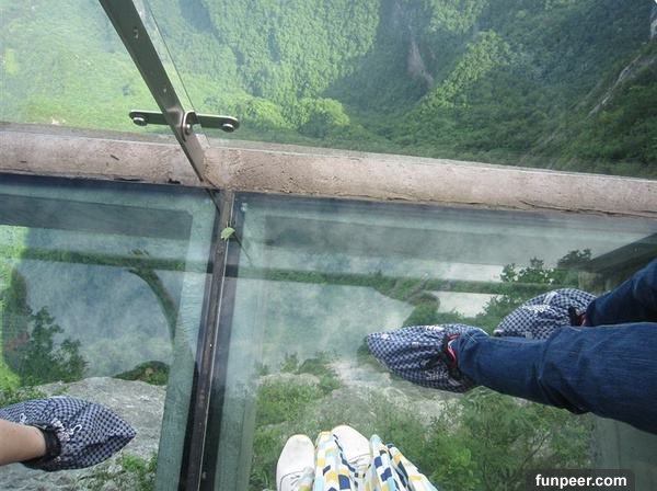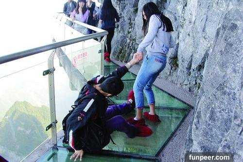 大叔原本信誓旦旦要挑戰這個「高1000公尺的透明步道」,沒想到他一站上去就… 膽子不夠大真的走不得啊!
