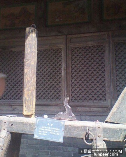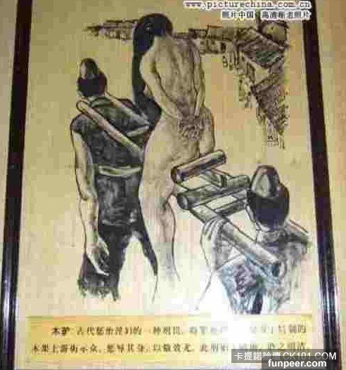 有一根二粗、一尺多長的圓木棍,向上豎著,象徵驢的器官,這就是這種刑具被稱為“木驢”的原因。女犯負痛,當然要掙扎,所以還要用四枚大鐵釘把女犯的兩條大腿釘在木驢上,然後由四名大漢抬著木驢遊街。