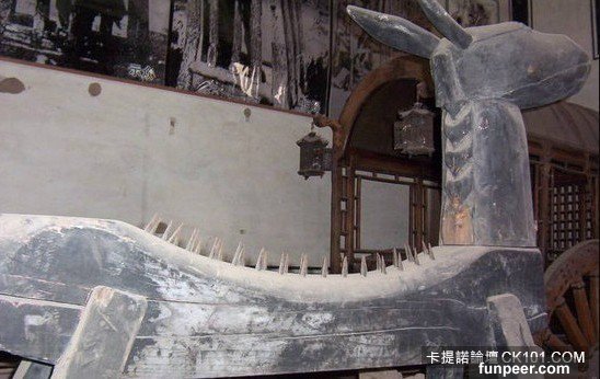 所謂木驢,其實就是一頭用木頭做成的驢,木驢背上,豎著一根大拇指粗的尖木樁。當女犯被強行按坐下去時,那根尖木樁就直直地刺進了她的下身。而且隨著木驢的走動,那根尖木樁也一伸一縮,弄得女犯下身鮮血淋漓,很多受此刑的女犯往往會慘死在木驢上。在古代這種刑罰常常用於懲處所謂的偷情淫婦。