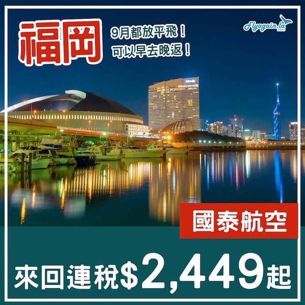 【福岡】靜雞雞放9月平飛!可早去晚返!國泰航空來回福岡連稅$2,449起!9月26日或之前出發