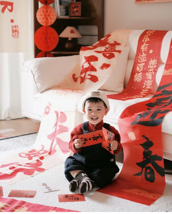 準備好一些紅紙/紅宣紙、毛筆、墨汁,已經會寫字的孩子,就可以教導他寫春聯;還不會寫字的則可以用畫的表達,一起用自己做的春聯開啟溫馨的一年!