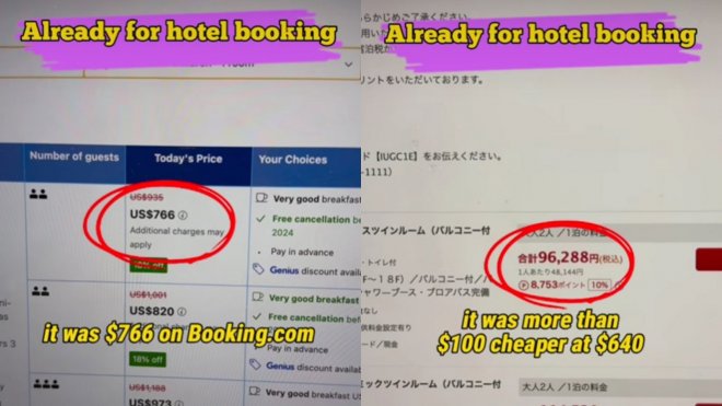 部落客「Tony"s YamaTrips」最近分享了他親身的經歷,證實了「觀光客價格」的存在。他舉例說,在東京某飯店使用全球知名的訂房網站Booking.com查詢同一天同一時段的雙人房價格為766美元(約新台幣24,826元)。然而,當他轉而使用日本當地的樂天旅遊網站查詢同一間房時,價格卻僅為660美元,相差了超過3,000新台幣。